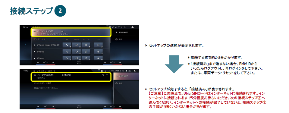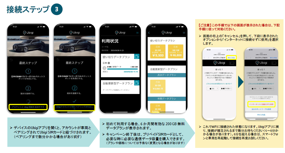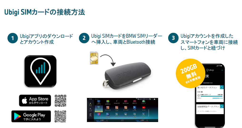 Ubigi SIM カードは、200GB 無料(6か月間有効)のキャンペーンがついており、キャンペーン終了後は、プリペイドSIMカードとして必要な時に必要な通信データ容量を購入できるBMW正式対応のSIMカードです。(※音声通話機能には非対応となっています)