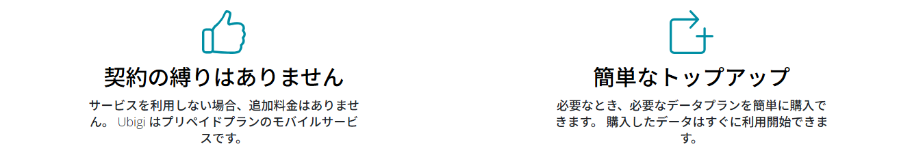 他のSIMカードは月額や年間契約ですが、Ubgiではプリペイド式となっているため契約の縛りがないのがメリット!