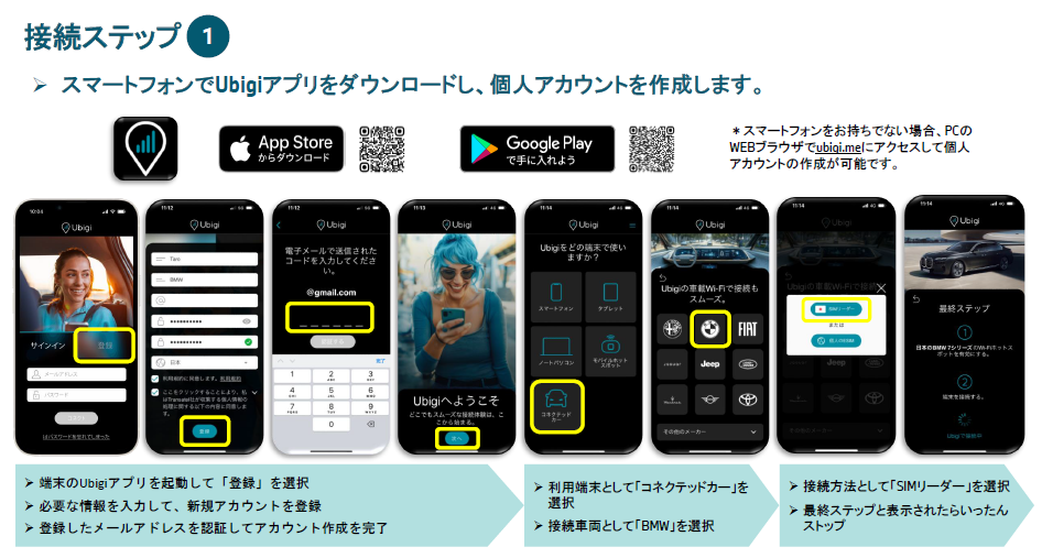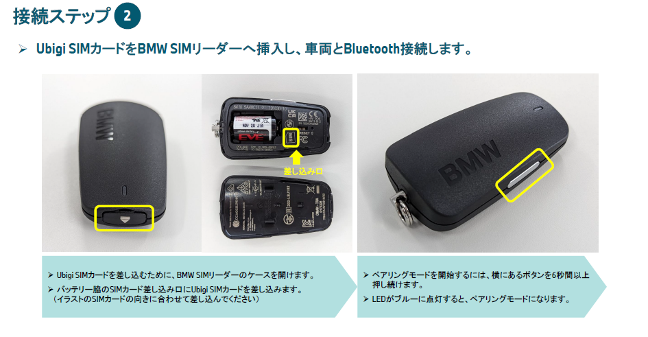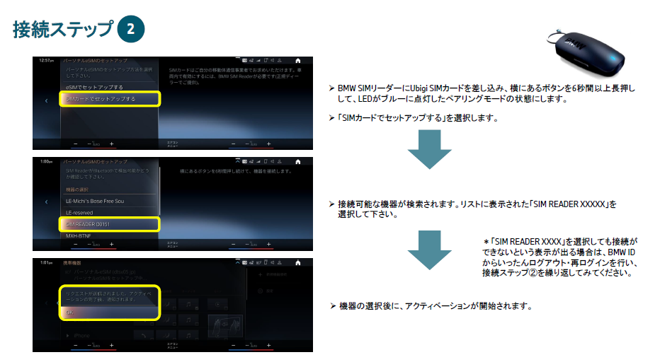 BMW SIMリーダーにUbigi SIMカードを挿入し車両とBluetooth接続することで、パーソナルeSIM機能が有効となり、車内エンターテインメントが利用可能となるサービス。
