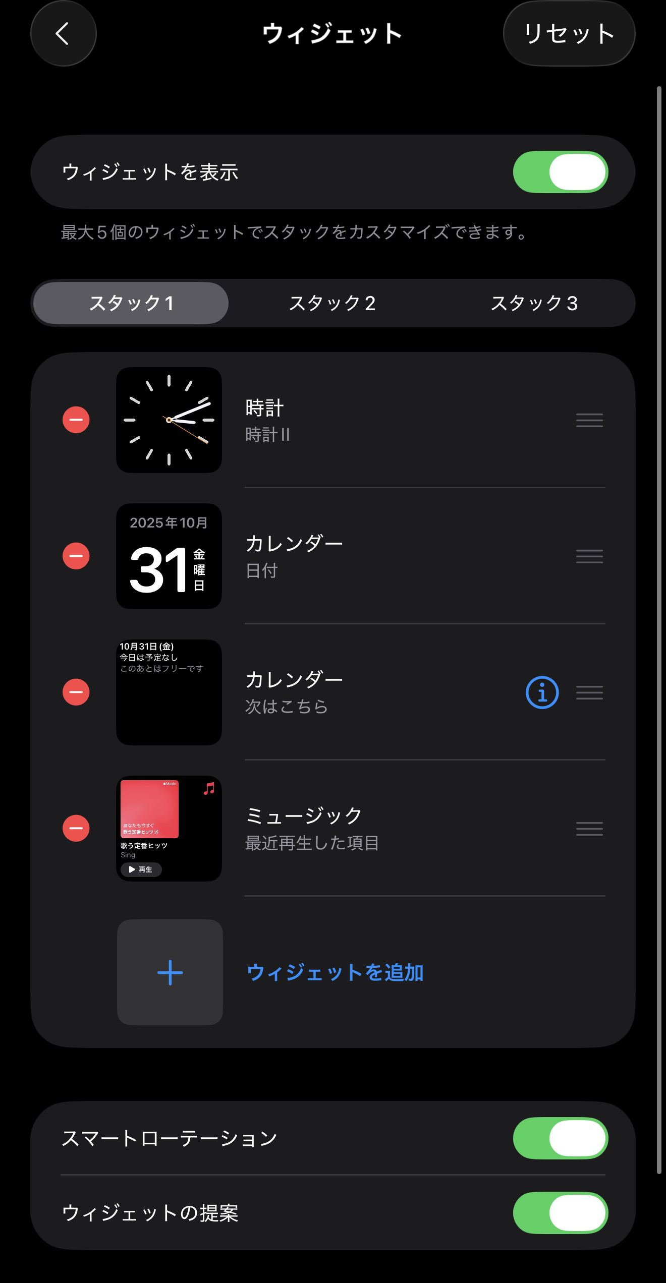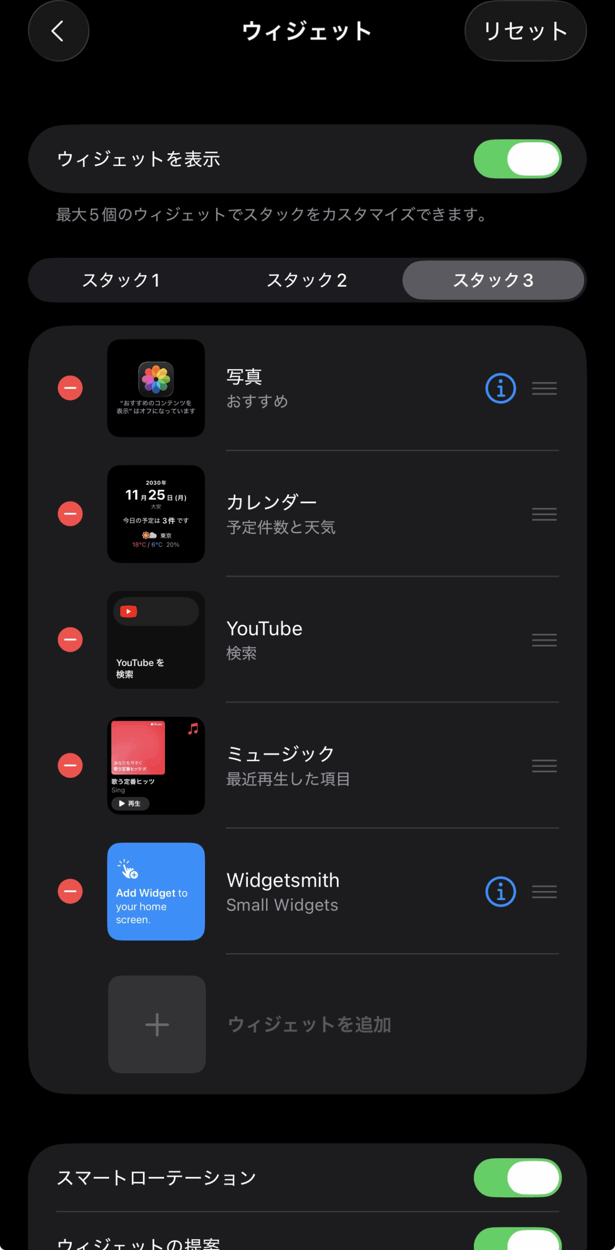 ウィジェット設定は三分割になっているため、「スタック1」「スタック2」「スタック3」として、それぞれ表示させたいものを自由に設定できます。