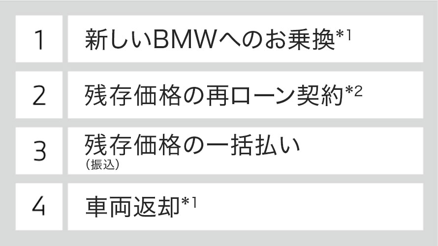 ②2年もしくは3年後のご契約満了時に保証条件を満たす場合、追加のお支払いなく新しいBMWへのお乗り換えや車両返却が可能です