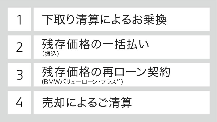 最新モデルのBMWへのお乗り換えや残存価格の一括払いなど、お客様のニーズに合わせてお選びいただけます。