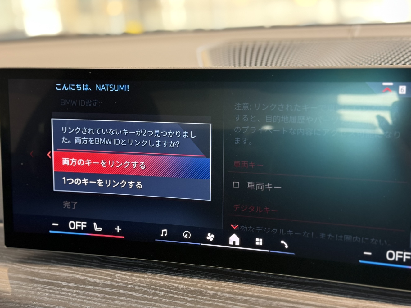 車内で2つの物理キーを認識した場合「2つのどちらをBMW IDに紐付けるか」という表示が出るため、オーナーは両方もしくは1つだけ紐付ける選択ができます。