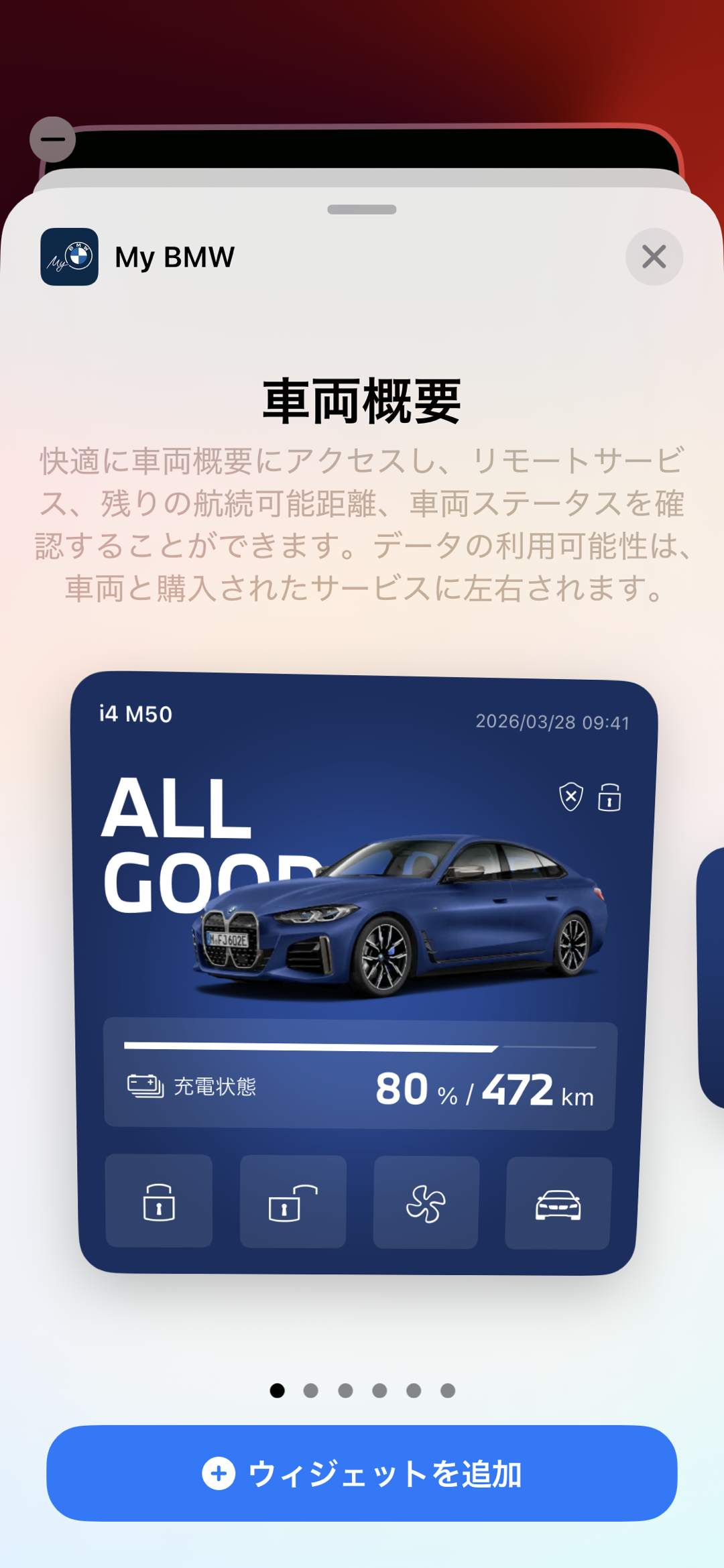 設定方法は、スマートフォンのホーム画面を長押しして「My BMW」のウィジェットを追加するだけ。