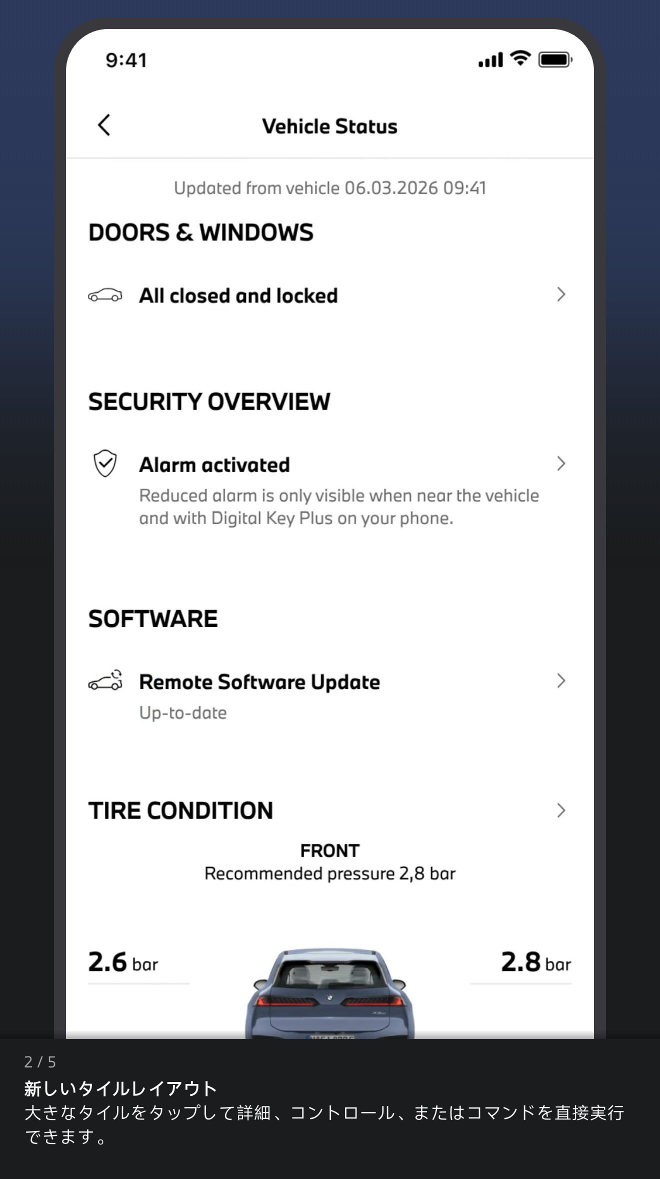 アプリから車両ステータスを開くと「ドア&ウィンドウ」「タイヤの状態」「サービス時期」「走行距離」を確認できます。