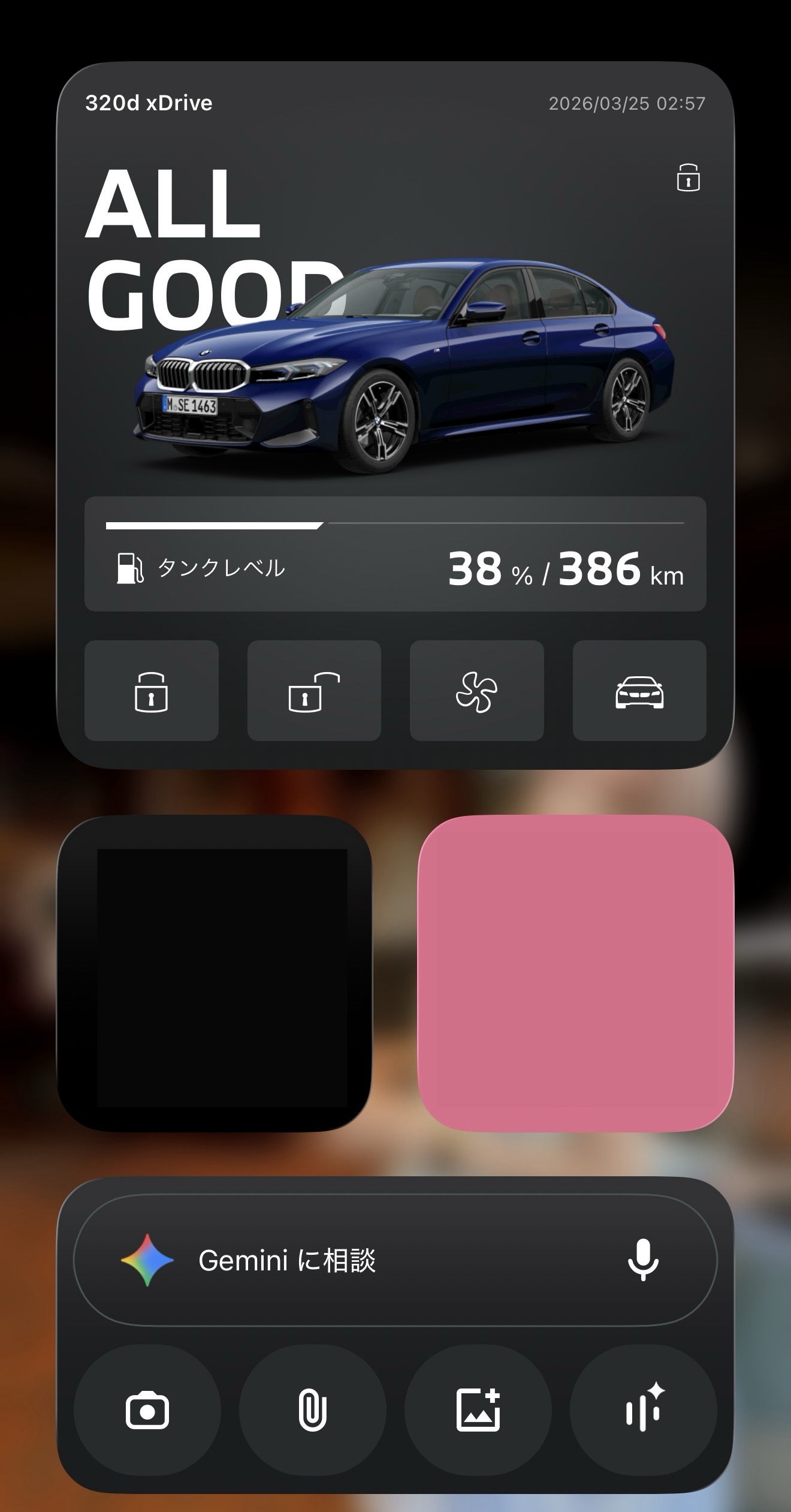 アプリをわざわざ探して開かなくても、スマホのホーム画面をパッと見るだけで愛車の最新ステータスがひと目で確認できるとっても便利な機能。