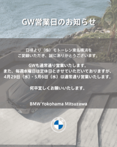 BMW横浜三ツ沢支店は、ゴールデンウィーク期間中も通常通り営業いたします。